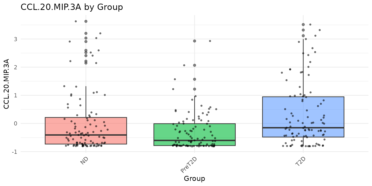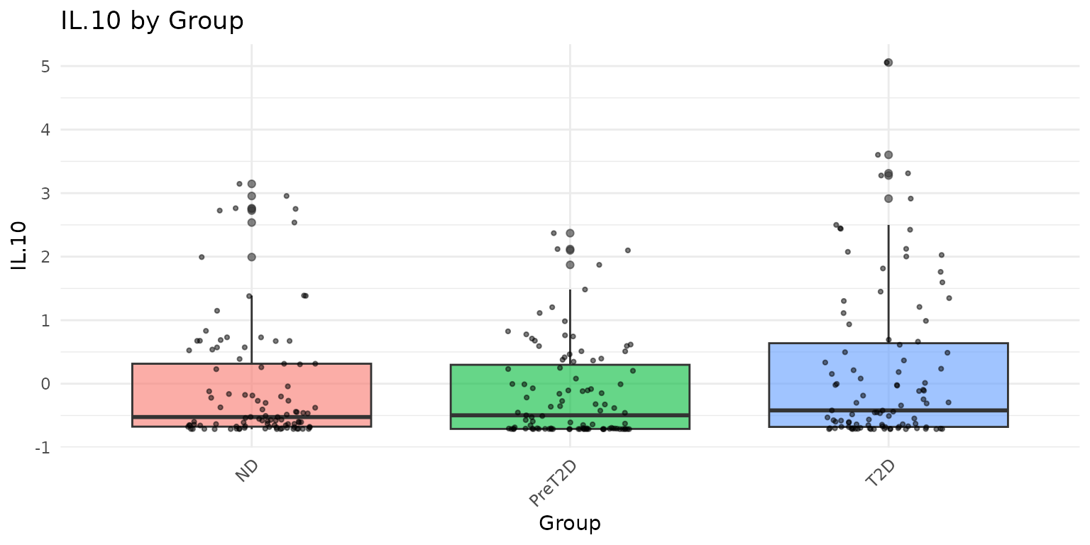 Interpreting the output: - Each boxplot shows the median (horizontal line), interquartile range (box), 1.5x IQR whiskers, and individual data points (jittered). - Overlapping distributions between groups suggest no strong group effect for that cytokine. - Outliers far beyond the whiskers warrant attention - consider whether they represent biological extremes or measurement artefacts.
