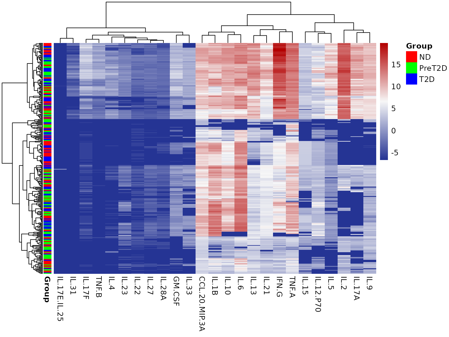 contains 297 observations of 25 cytokines along with Group,