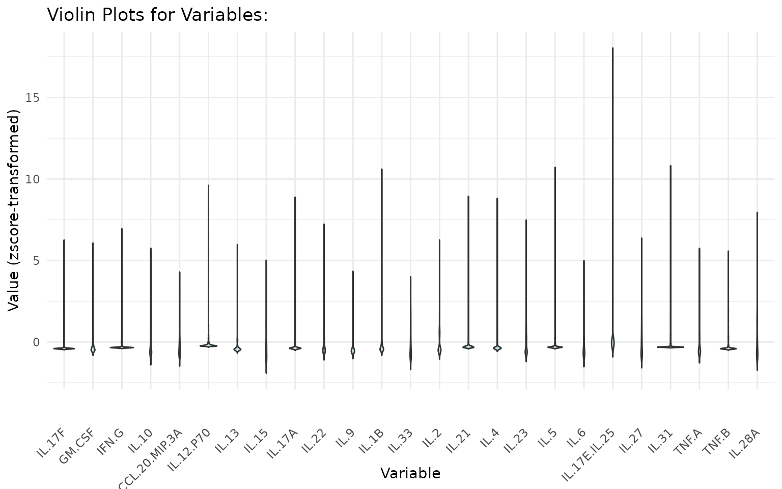 NA) are handled internally by most functions, but rows with all-missing cytokine values should be removed prior to analysis.