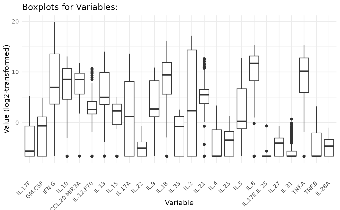 This function generates boxplots for numeric variables in a data frame or matrix. It supports optional grouping by one or more categorical variables. Numeric variables can be scaled using various transformations before plotting. When grouping is not used, boxplots are arranged in pages with a specified maximum number of plots per page. Plots can be saved to a PDF file or displayed on the current graphics device.